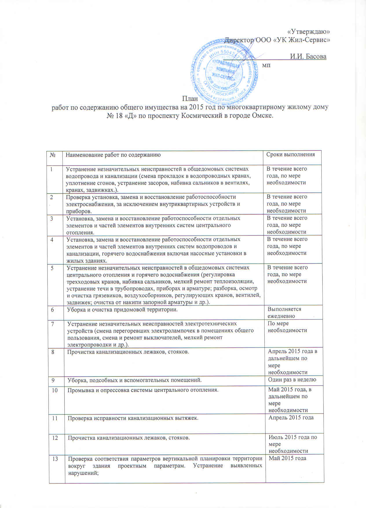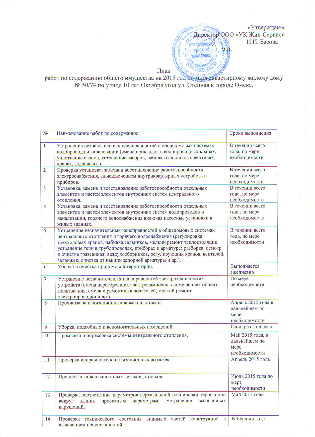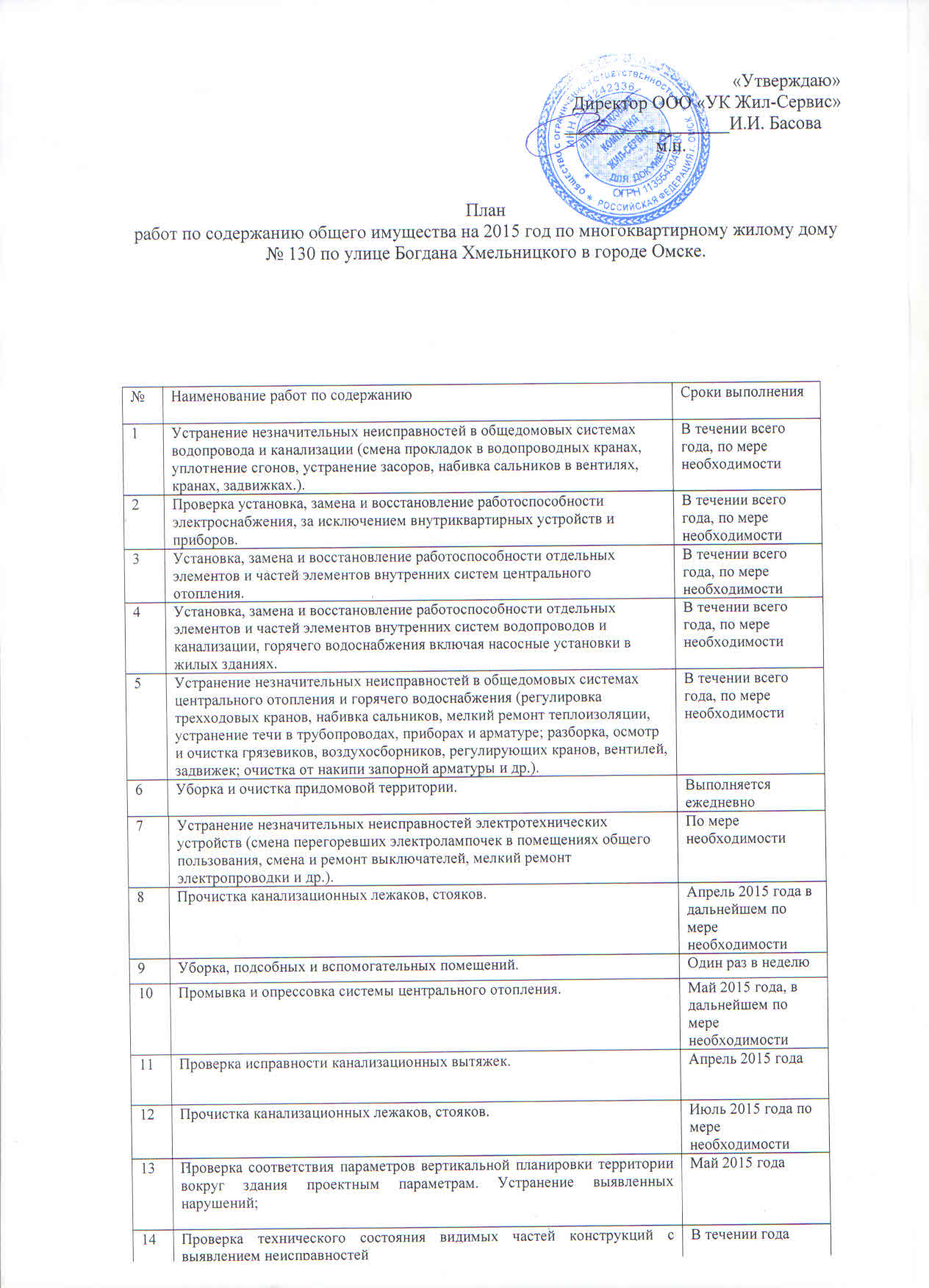 План работ по содержанию общего имущества на 2015 год:
