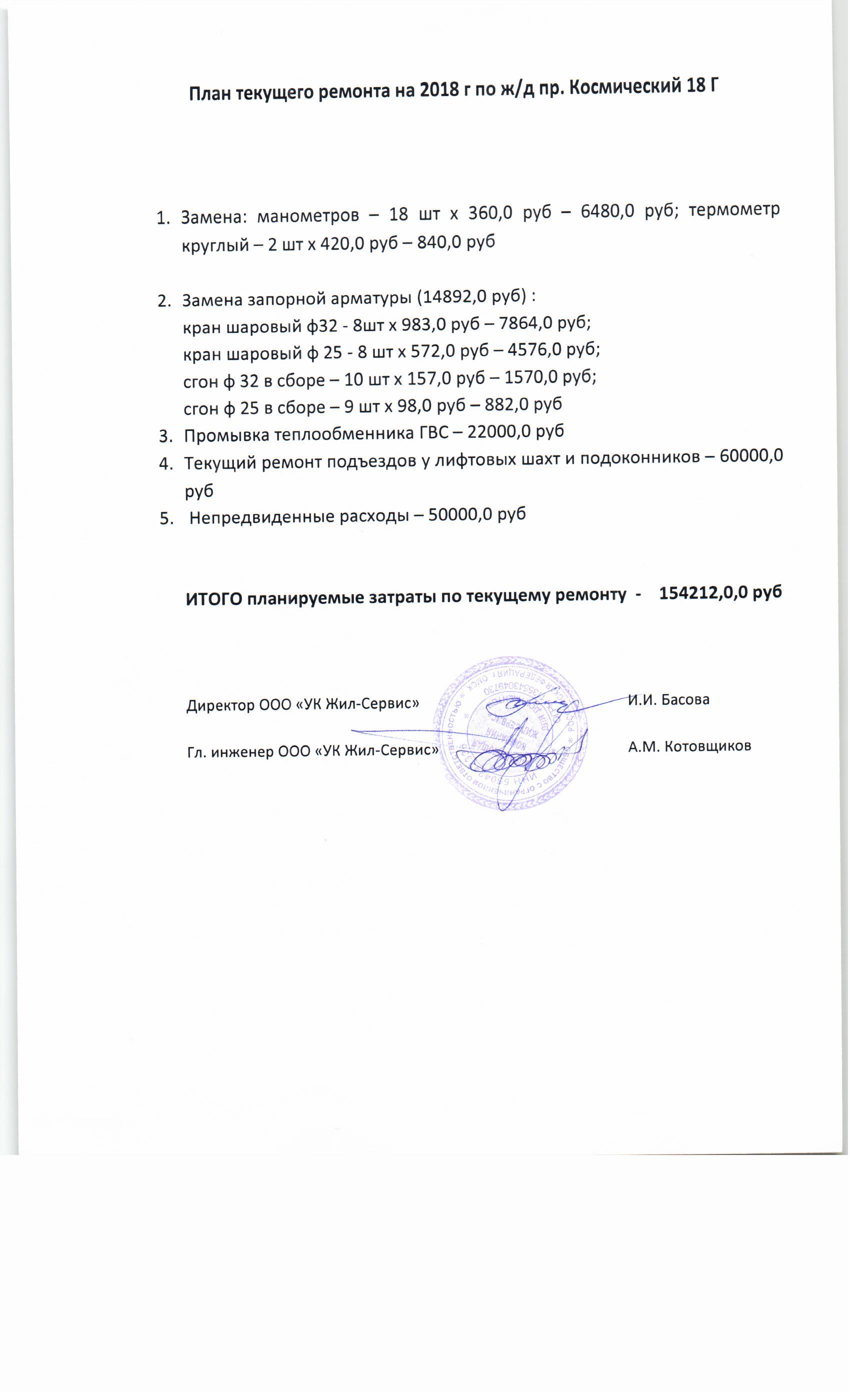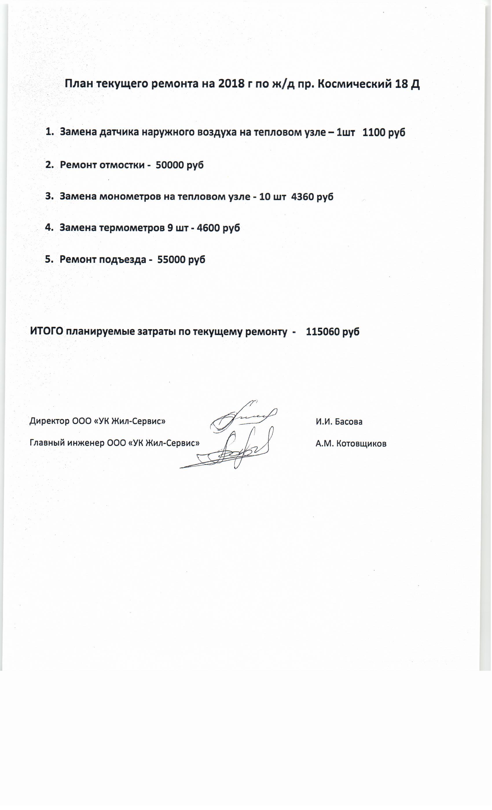 План работы по текущему ремонту многоквартирных домов на 2018 год: